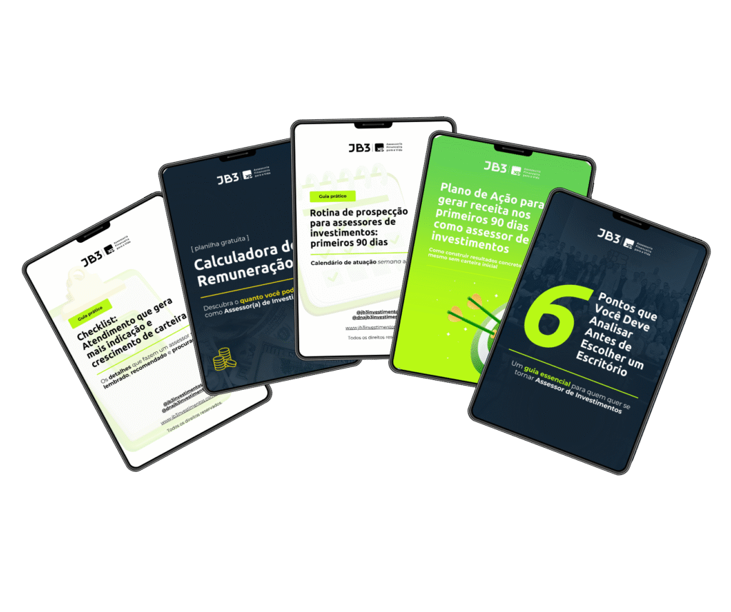 5 materiais práticos e gratuitos para montar sua rotina, atrair os novos clientes e acelerar sua rentabilidade como assessor com método comprovado por +130 assessores do DNA JB3.